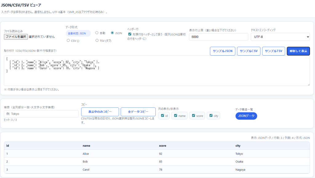 このJSON・CSV・TSVビューアは、ブラウザだけで使える確認用ツールです。
