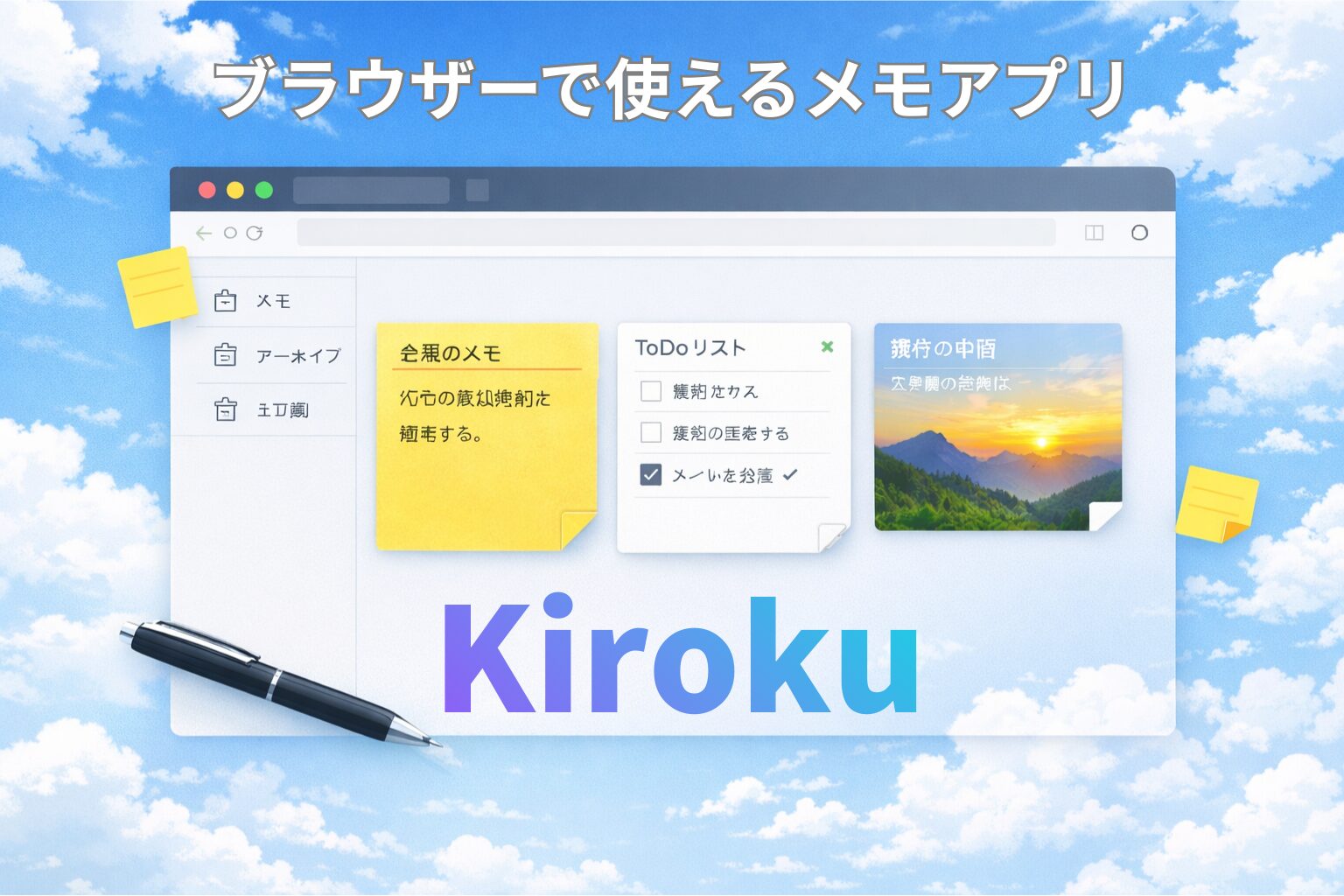 Kirokuは、HTML・CSS・JavaScriptだけで作られた、インストール不要のメモアプリです。
